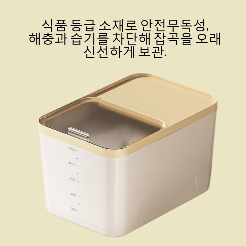 식품급 재질로 제작되어 안전하게 잡곡과 쌀을 보관, 방충·방습 기능으로 신선도 유지, 밀봉 설계로 효과적인 저장, 다양한 곡물 보관에 적합